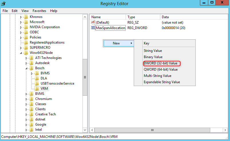 In case the HideLiveReplayPage (DWORD) is not in HKLM/SOFTWARE/WOW6432NODE/Bosch/VRM, you can create it by right clicking in the VRM registry key > select New > select DWORD (32-bit) Value > type in "HideLiveReplayPage" and set value to 0 or 1 (as you wish)