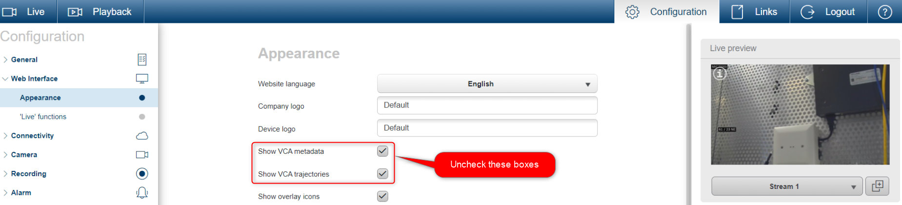 How to disable VCA metadata& trajectories on MIC IP starlight 7000i camera on the web browser video?
