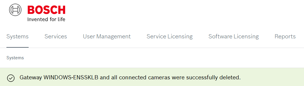 A green banner shows that the DIVAR IP, with its connected cameras was removed from Remote Portal