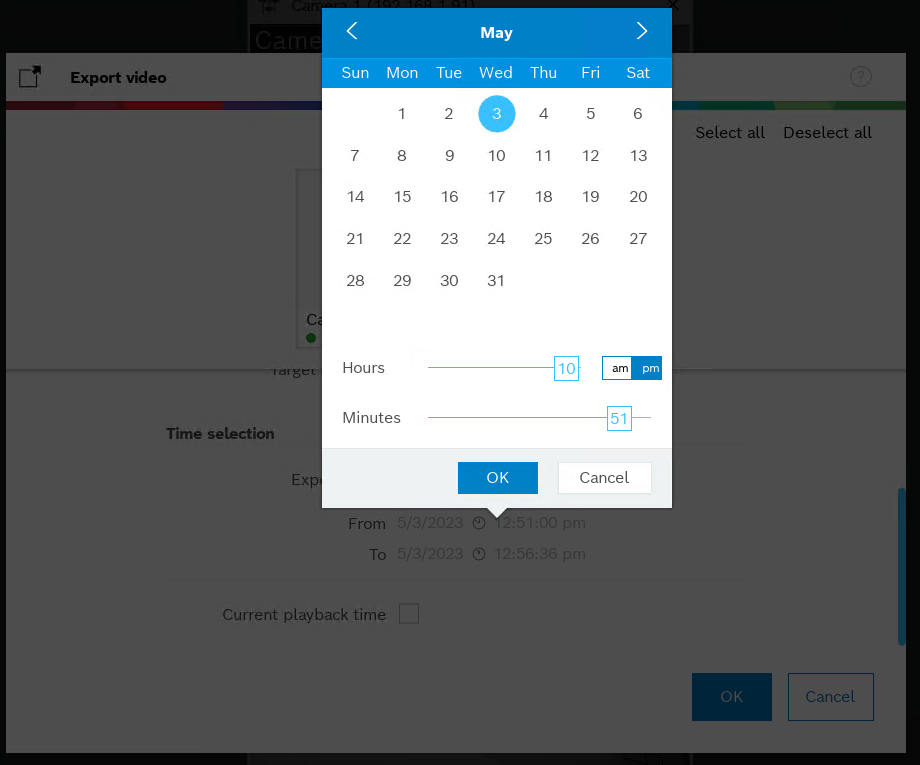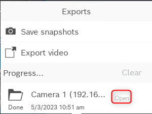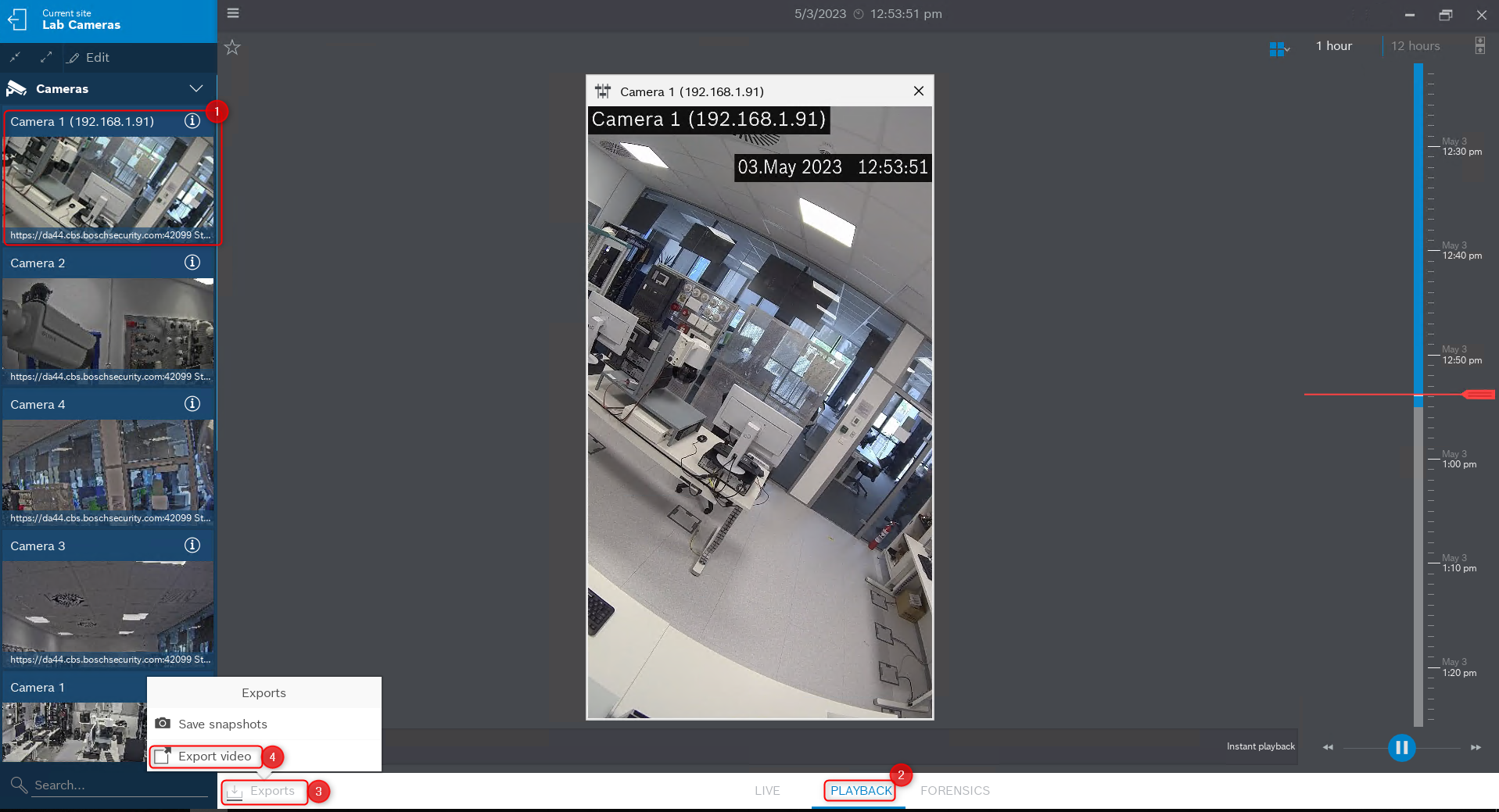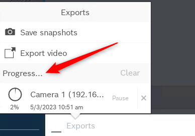 2. Select your camera and click on the Playback button > click Exports and select Export video:
