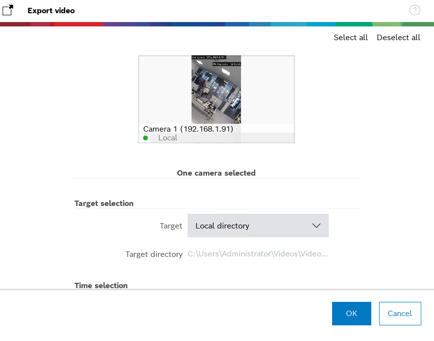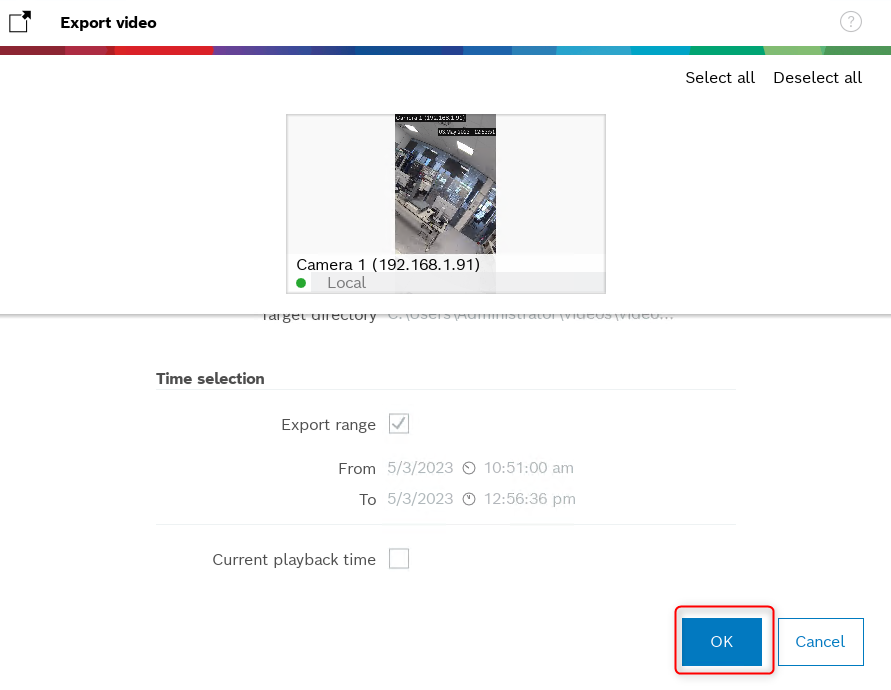 3. Set the Target as Local directory and select the time range for which you would like to export the video > click OK