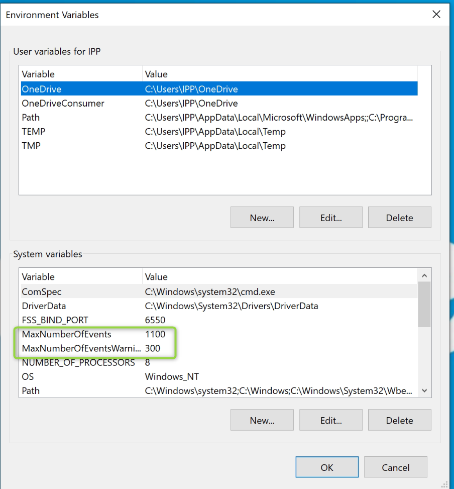 - Create a Windows environment variable 'MaxNumberOfEvents' with the newly chosen value.