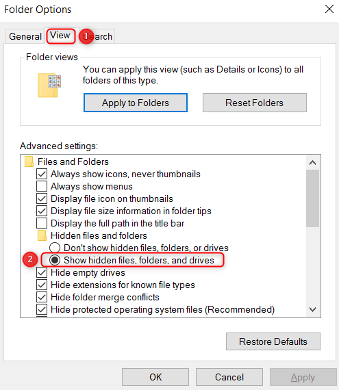 2. From the "Folder Options" pop-up menu > select the View tab > select "Show hidden files, folders, amd drives