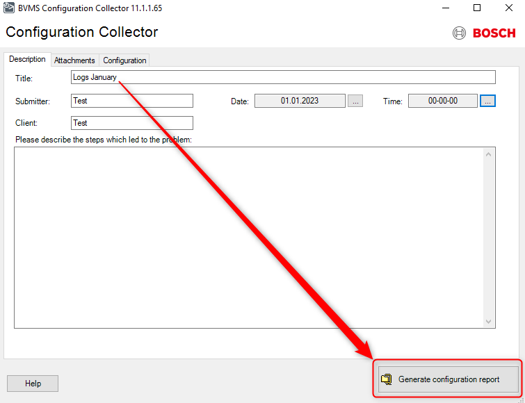 Bosch VMS Configuration Collector is used to collect Bosch VMS relevant items and pack them in a single .zip file. This .zip file contains a configuration report with all relevant diagnostic information to help Bosch Support to understand, reproduce and resolve customer issues.