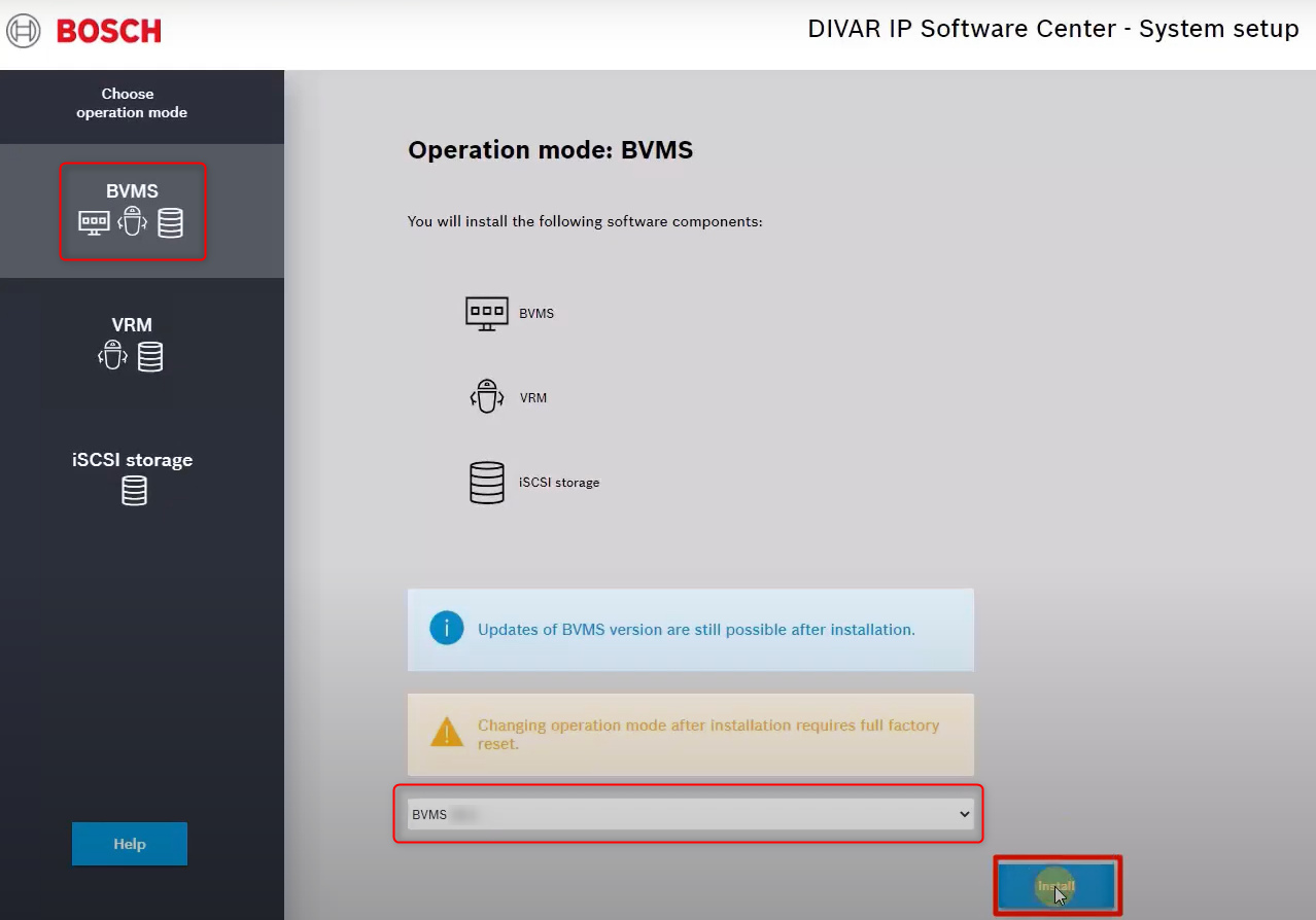 The BVMS software has to be installed from Software Center. If you do not install BVMS using the Software Center, the iSCSI may not be configured correctly and the VHDs will appear as Not Connected- In the Operation mode selection screens, choose the software version of the package that shall be installed on the system. Click Install button at the bottom of the page.