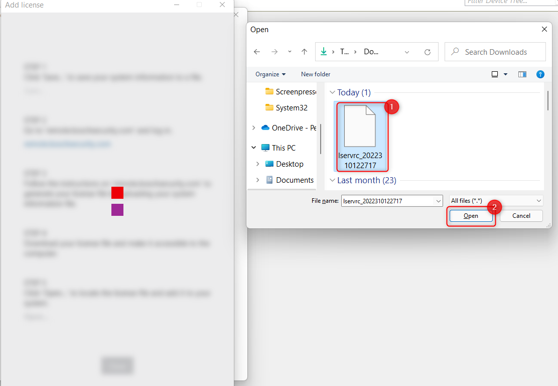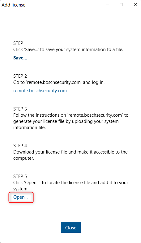5. Select the lservrc_xxx... file downloaded from Bosch Remote Portal and click Open