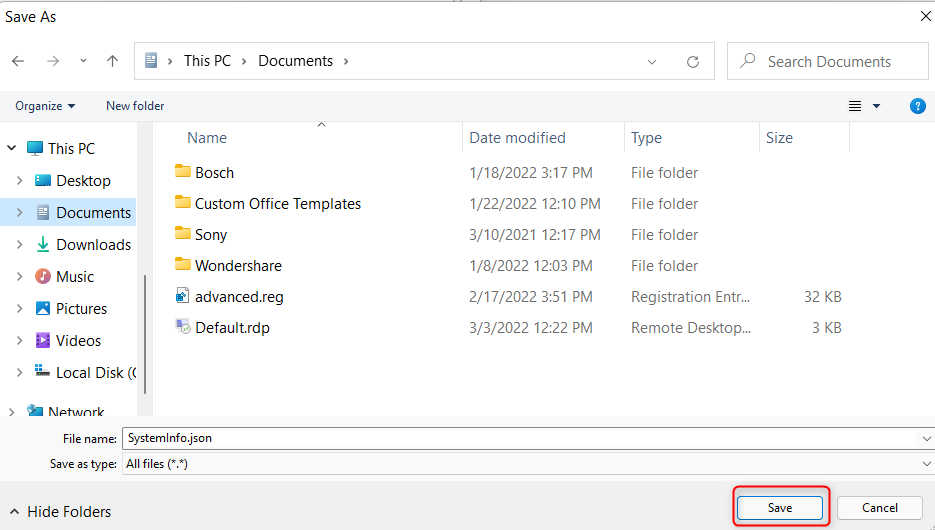 4. Click the Save button and a file with the SystemInfo will be created. Save the SystemInfo file on your computer.