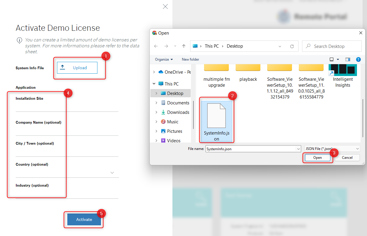 2. The Activate Demo License window will appear. Upload the SystemInfo file that you saved earlier. Fill in the required information and click Activate