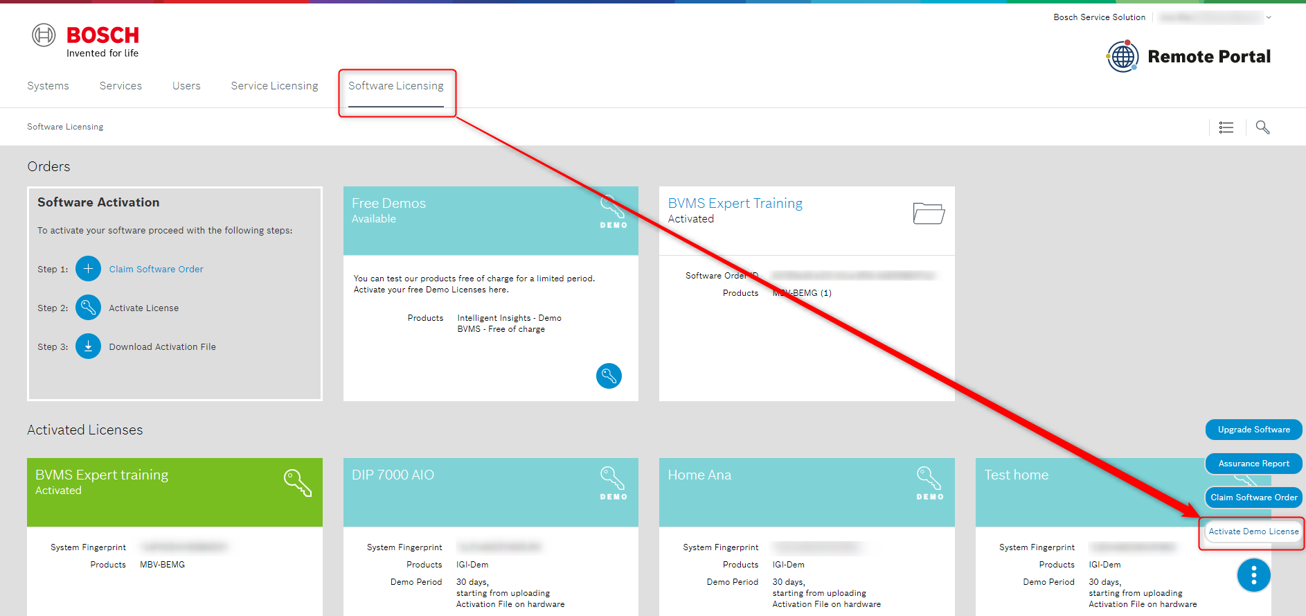 Go to the Software Licensing tab in the Remote Portal toolbar > click Activate Demo License in the bottom right corner of the display.
