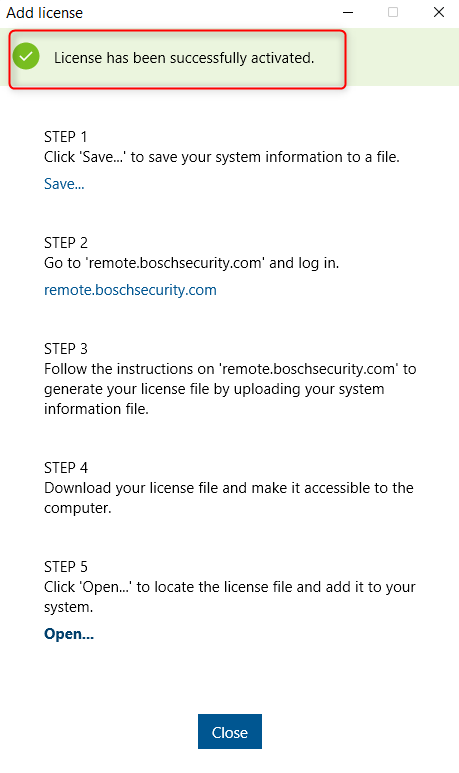 4. Upload the generated activation file. Go back to your BVMS Viewer Configuration Client application and click the Open button under STEP 5 to upload your activation file.