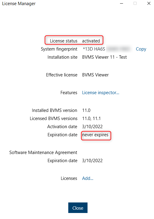 A new window will pop-up and you will see the details of the BVMS Viewer 11 license: