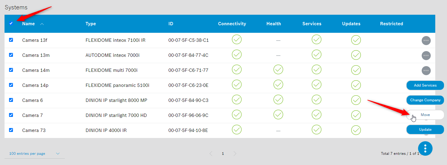 - There must not be any activity ongoing for this camera(s) (e.g. no firmware update, no company change ongoing) before the camera(s) can be moved.