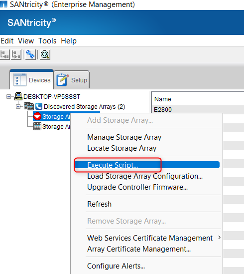 2. Right click on the DSA E2800 unit you want to perform a full factory default for and select "Execute Script..."