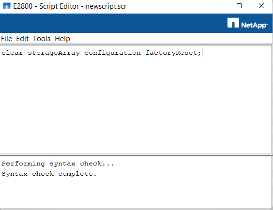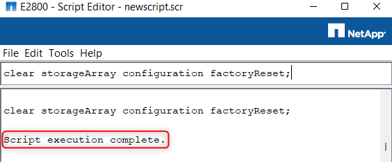 3. Paste the following command: clear storageArray configuration factoryReset;