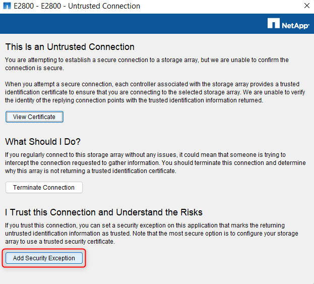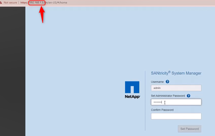 This way, you will find the new IP Address assigned on your unit via webpage. In this step you must add the new credentials of your NetApp DSA E2800