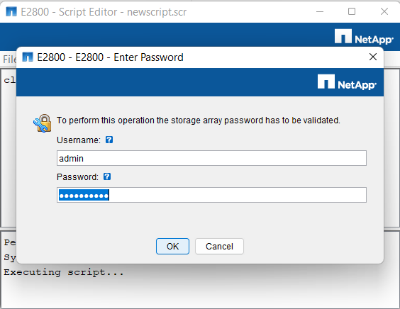 7. Before performing this action, you should enter the credentials of your DSA E2800 unit and click OK