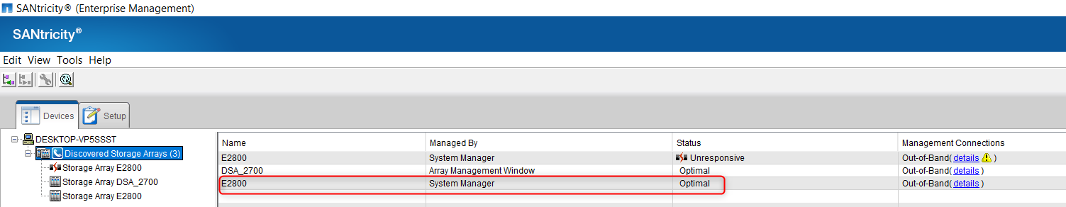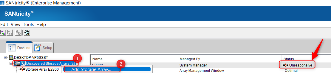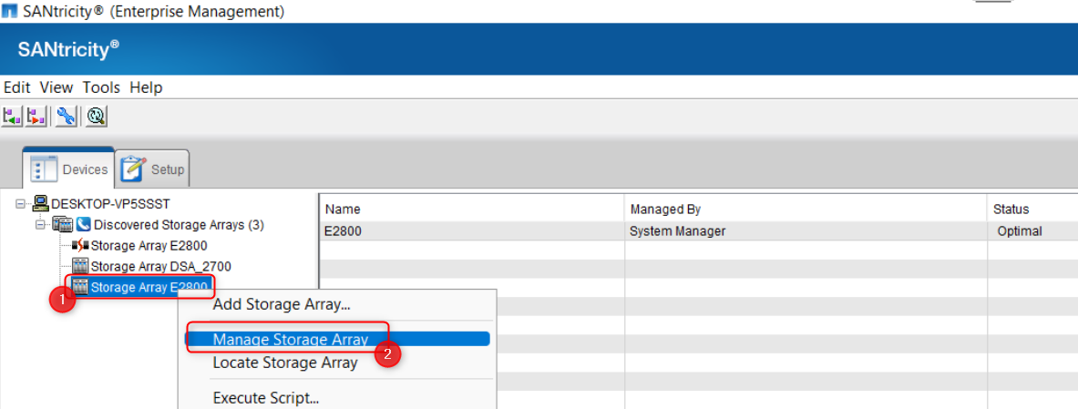 1. Open SANtricity Storage Manager App and search for your DSA E2800 under the device menu