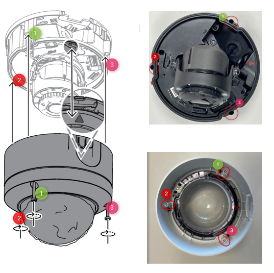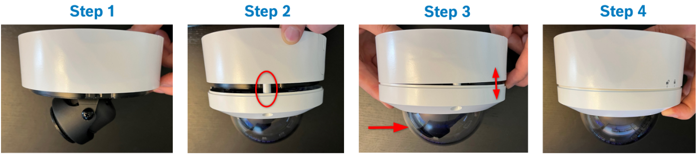 The same process applies to the indoor camera where after the alignment pillars are engaged (step 2) the bubble + camera housing can be tilted (step 3)