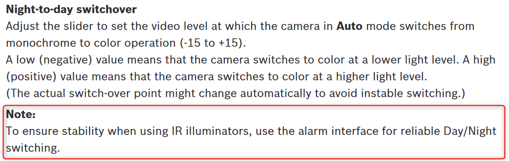 - Cameras are outdoor, for example next to a highway or road and headlights causing the camera to switch to Day-Mode