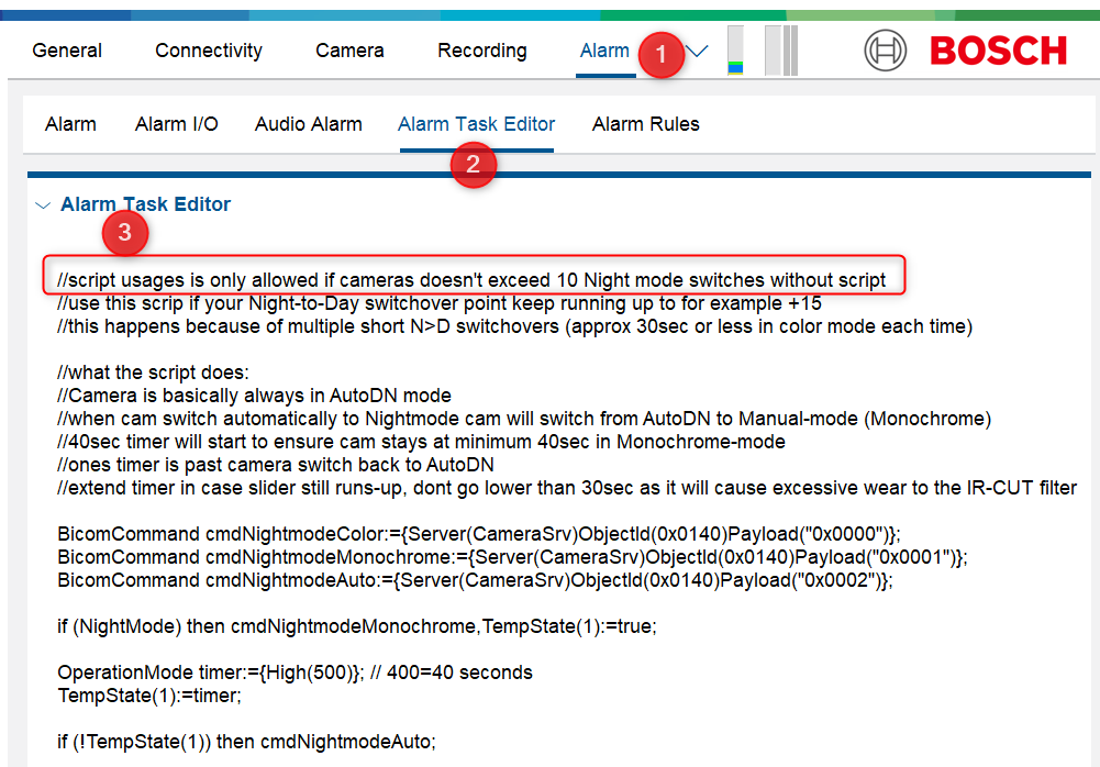 - Switch Permanent to Color-mode, especially for well lit environments during the evening this can be a good option due to the good light sensitivity of the Bosch Cameras