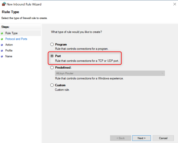 - Select "Port" and click Next.
