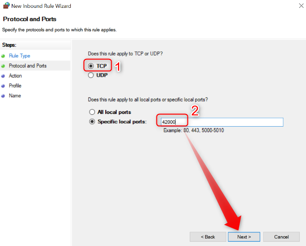 - Add the protocol (TCP or UDP) and the port number into the next window and click Next.