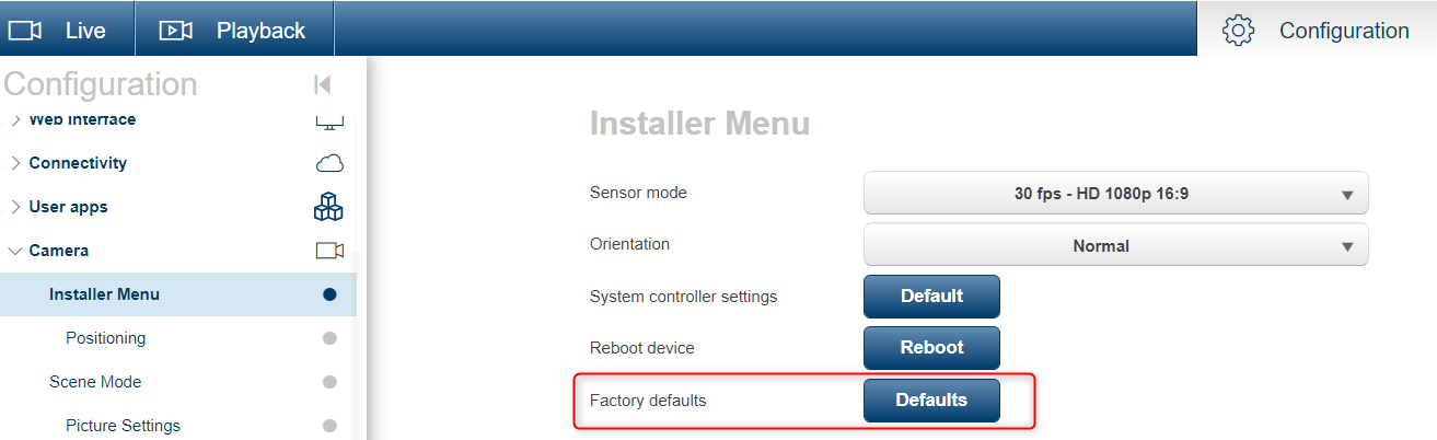 4) Factory reset via WEB GUI > Installer menu