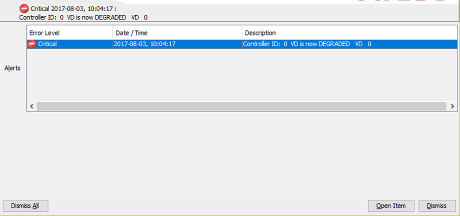 The MegaRAID controller will automatically detect if a disk has errors causing the RAID volume to be degraded. An error message will appear on the desktop of that system.