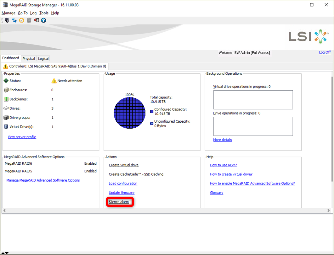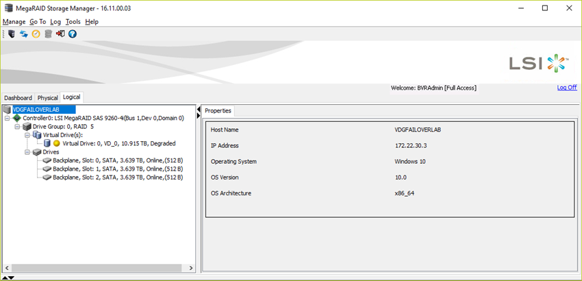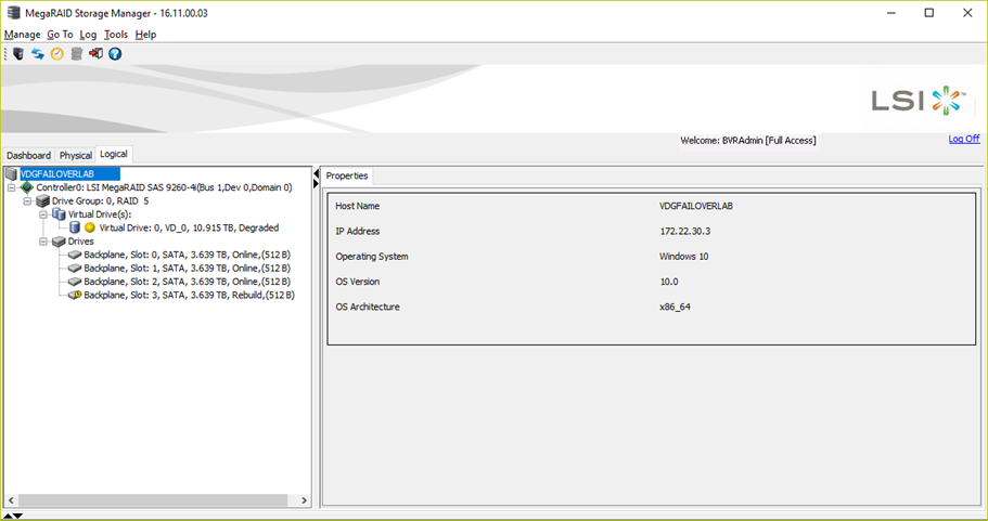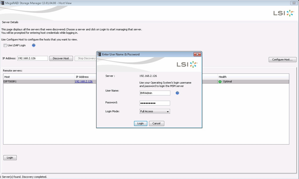 To determine which disk is broken, the MegaRAID Storage Manager needs to be opened. Use the windows credentials to login, by default BVRAdmin/WSS4Bosch: