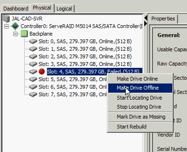 By clicking the ‘Logical’ tab, the actual status of the drive unit is displayed. In this case the fourth disk (out of three) is broken and missing.