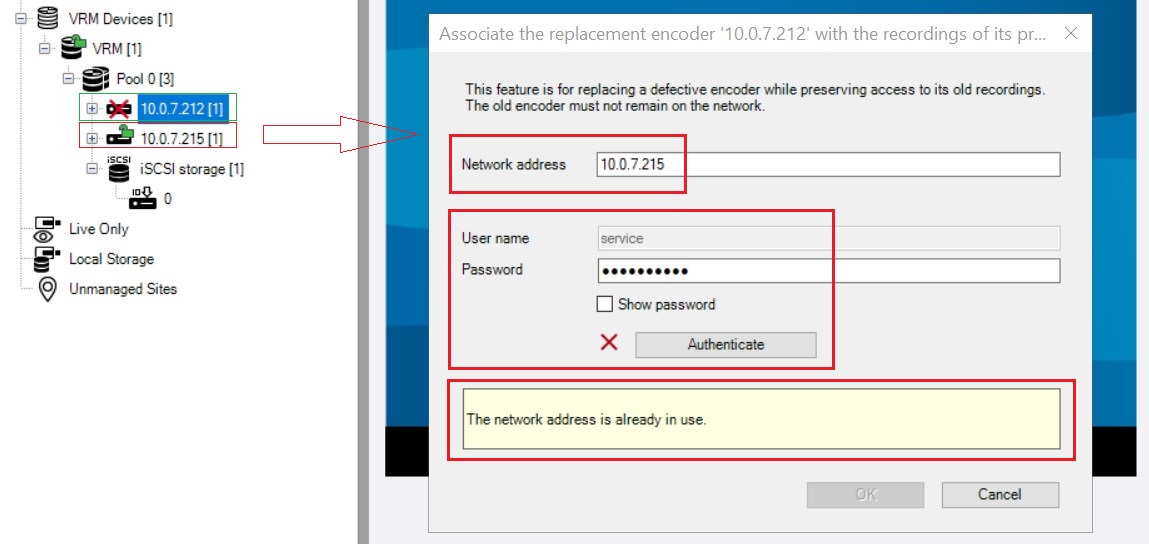 The new camera which should replace the old camera must not be added to the device tree in Configuration Client by the "Scan for Encoder" or "Add Encoder" option.