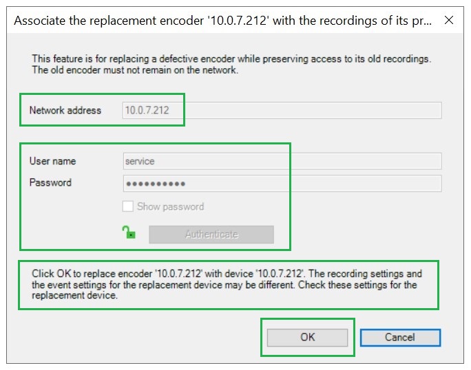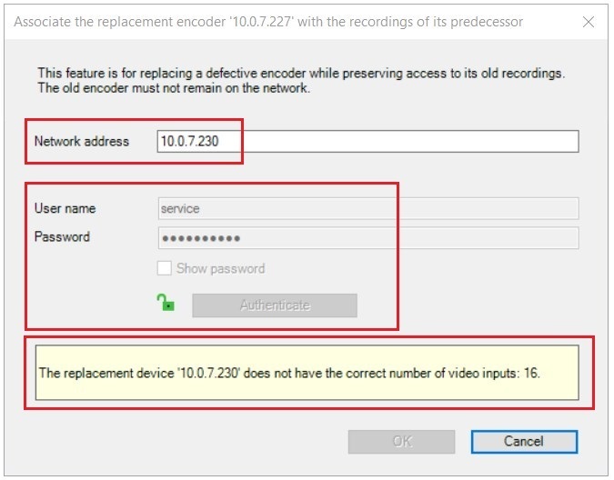 Devices can only be replaced by other devices that have the same number or video inputs, i.e., camera replaced by camera, multichannel encoder replaced by multichannel encoder.