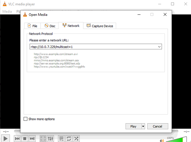 (Note: When you open in VLC the camera stream 1 it e.g. streams to MC group: 226.1.2.3 port:60000) - Example : with defined Multicast-group + port: