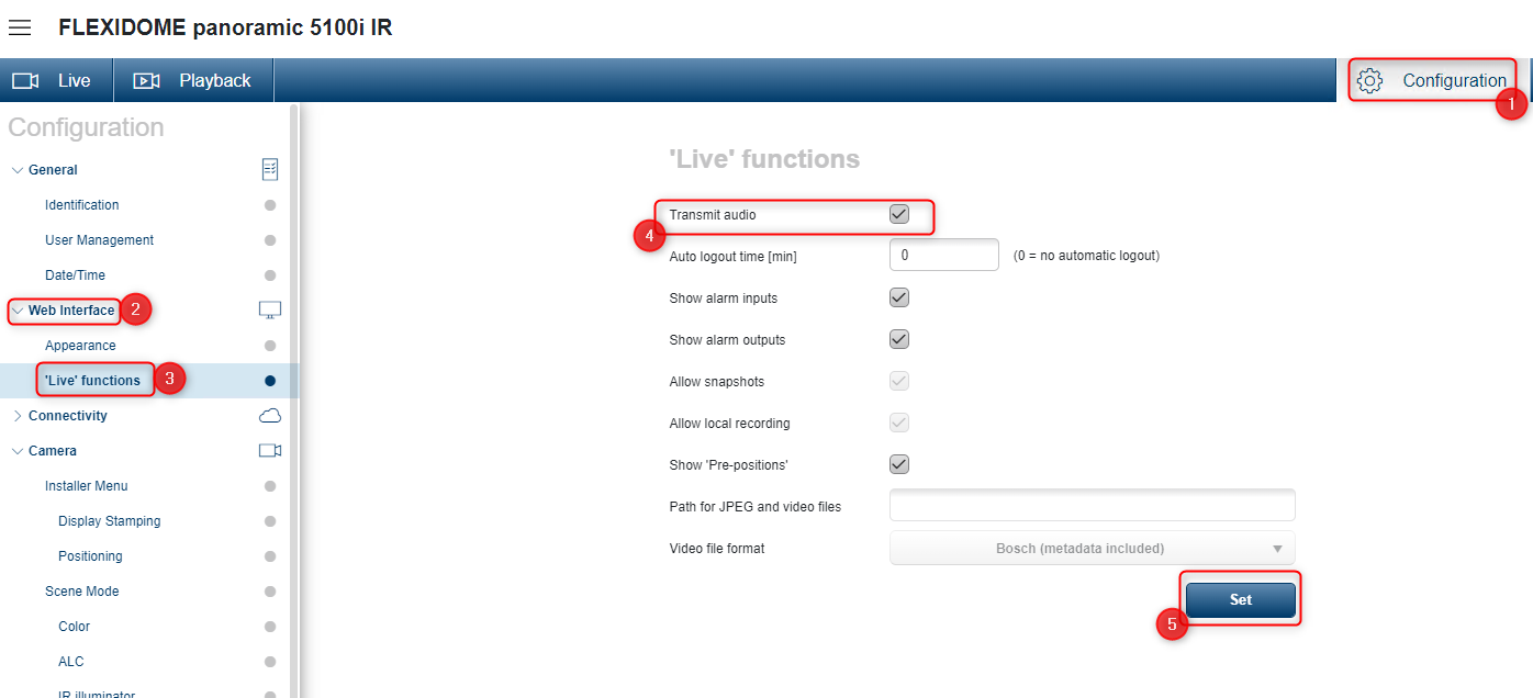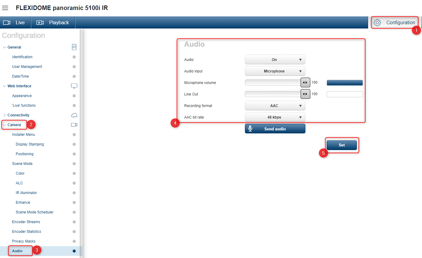 5) Enable audio on the live page (Web->Configuration->Web interface->Live Functions->Transmit audio)