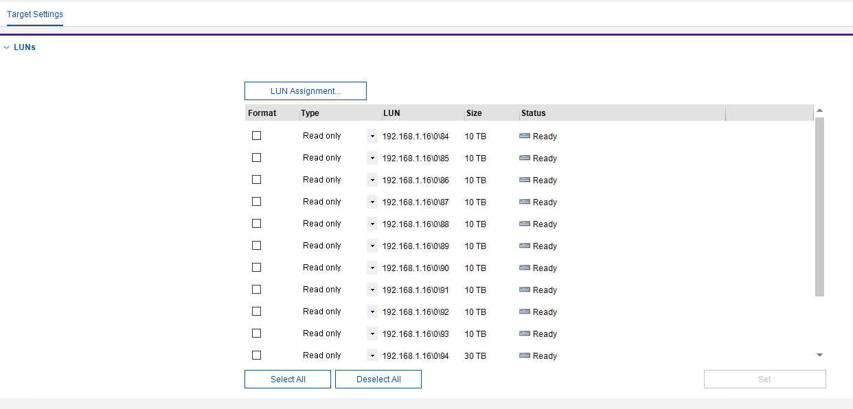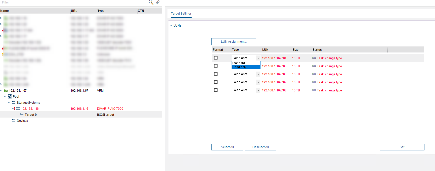 3. Set all LUNs to the Type Read Only, press the button Set and acknowledge it in the next window.