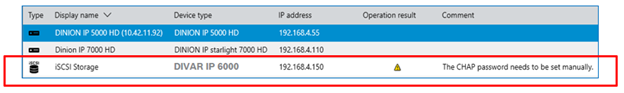 4. Note the IP-addresses of all iSCSI storage devices which are indicated in the “comments” field: “The CHAP password needs to be set manually”. For example: All DIVAR IP xxxxx devices