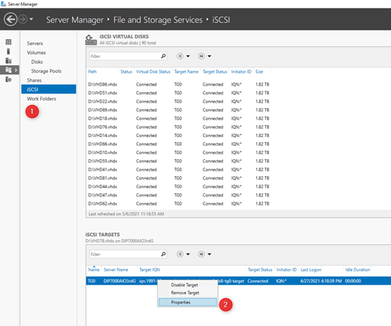 - Open the Server Manager and navigate to File and Storage Services → iSCSI