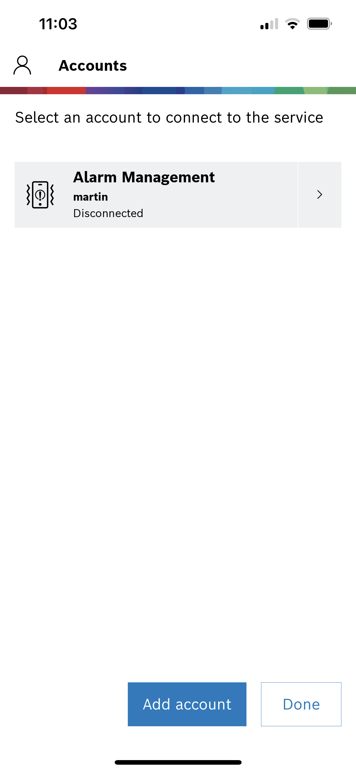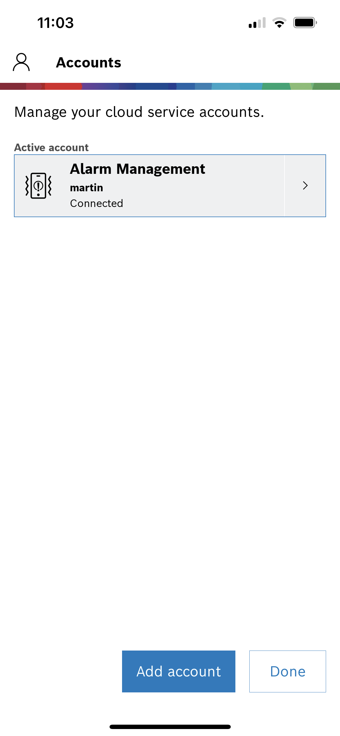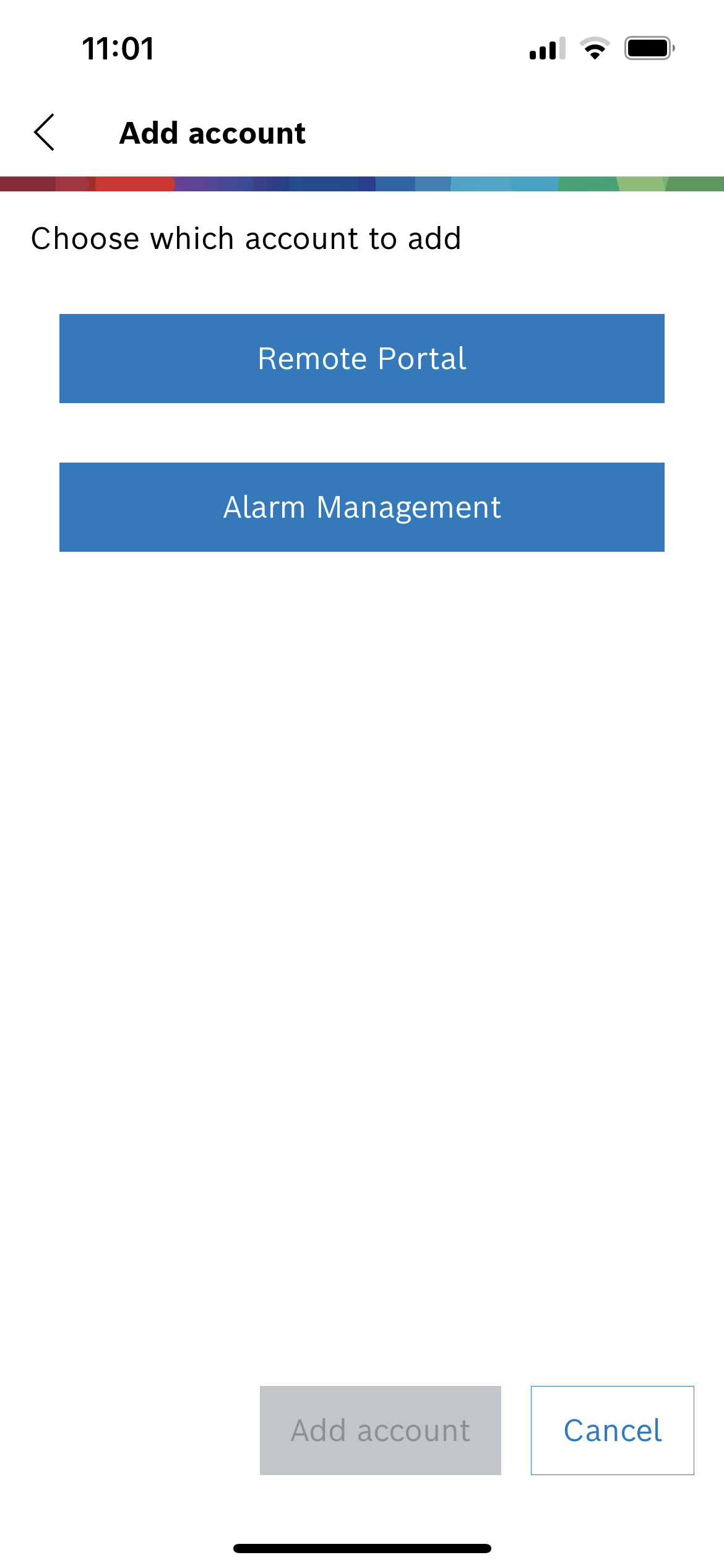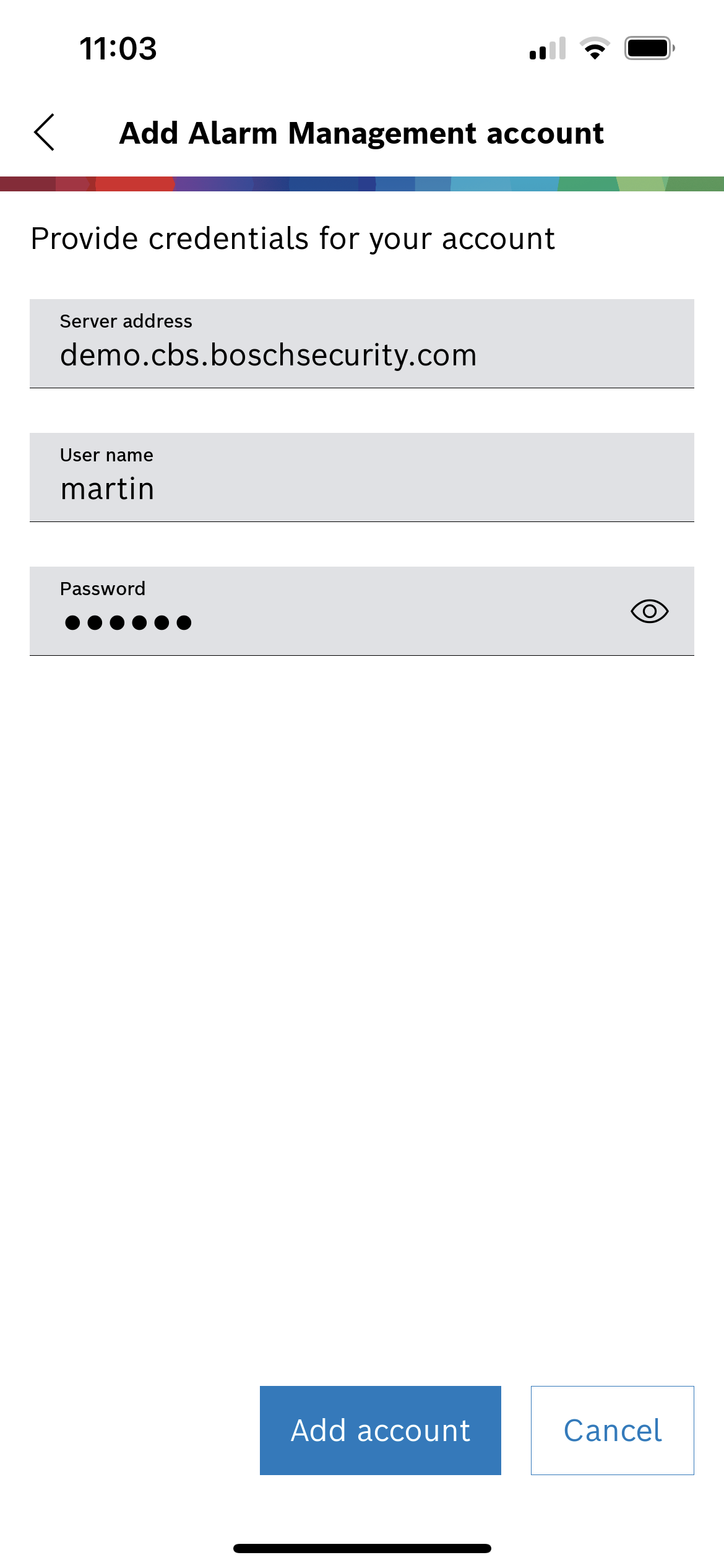 4. Select Alarm Management, enter server address, user name and password and tap Add account