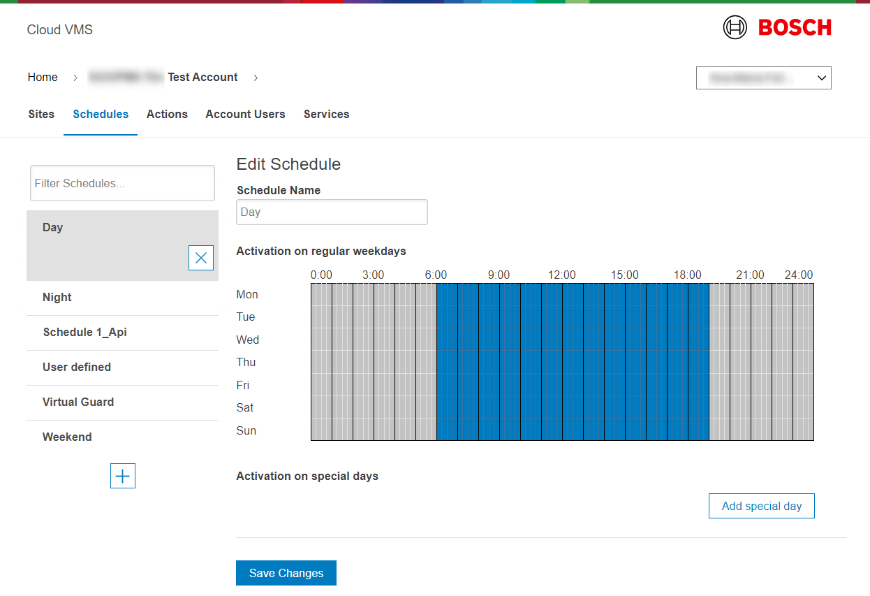 3. Click tab 'Schedules' and modify the standard schedules 'Day', 'Night' and 'Weekend' if needed, or add new schedules.