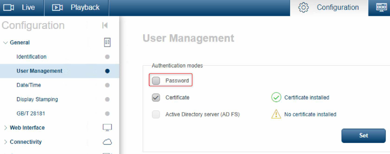 4. Now the Certificate based user has been configured, you can disable the Password login option via the camera webpage.