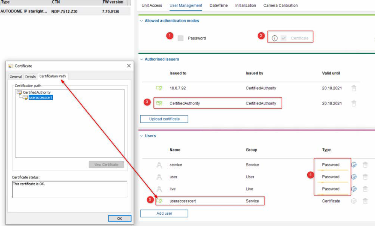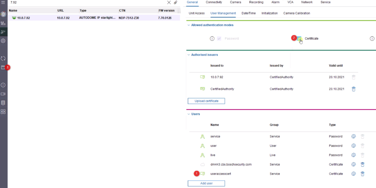 All clients who wants to access the camera would need the certificate. Once de-activated, the access via Config-Manager remains