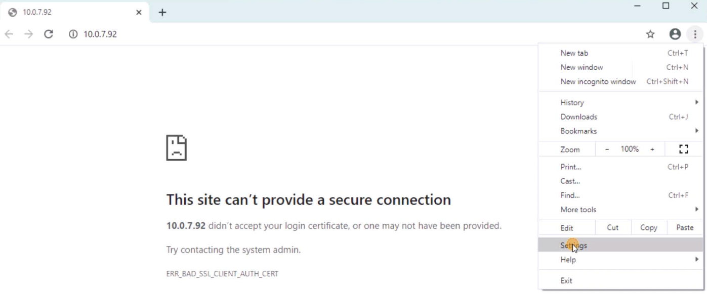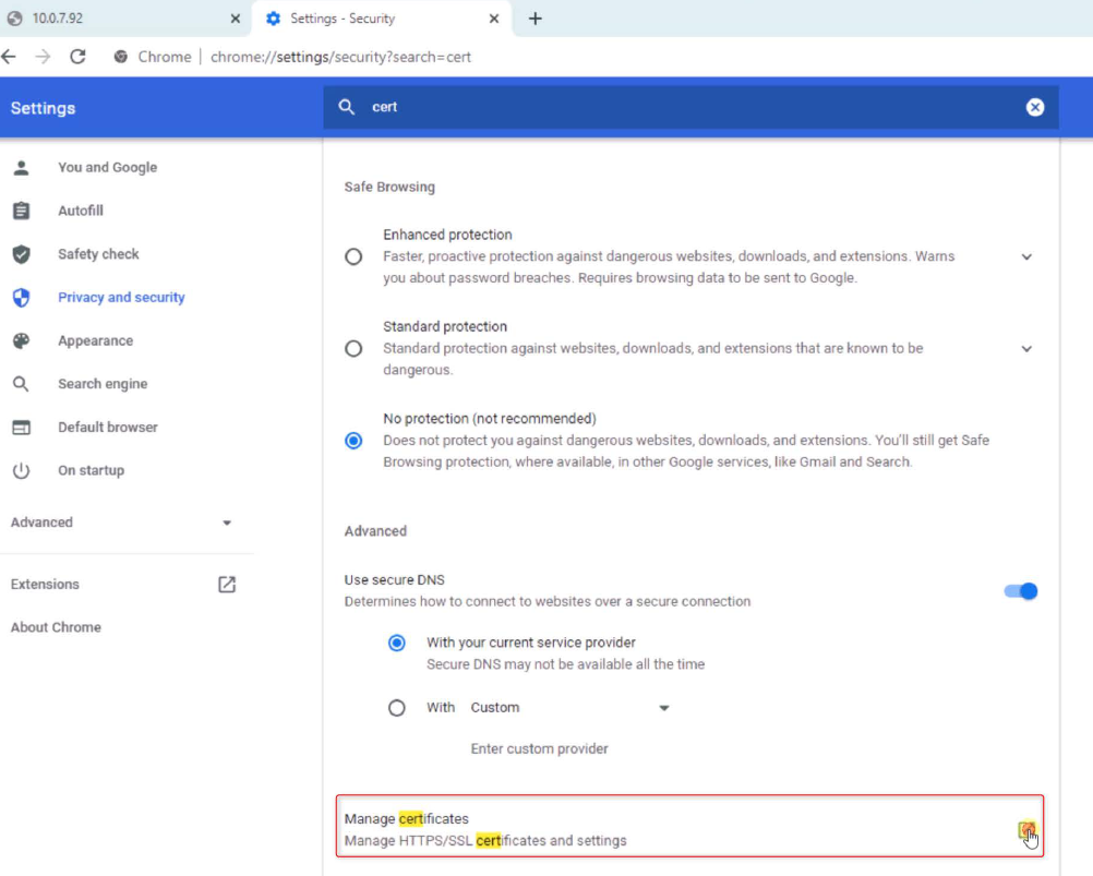 7. Go to Chrome settings > Privacy and Security > Security > Manage Certificates