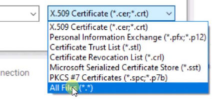 d. Select “All Files” so you be able to view the .pfx extension, and browse to the Certificate