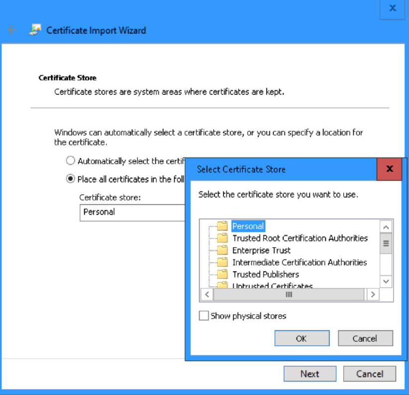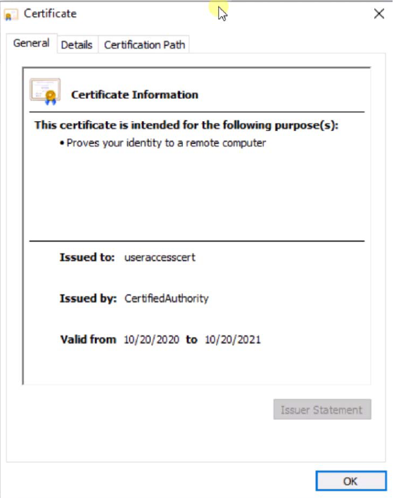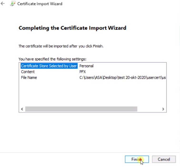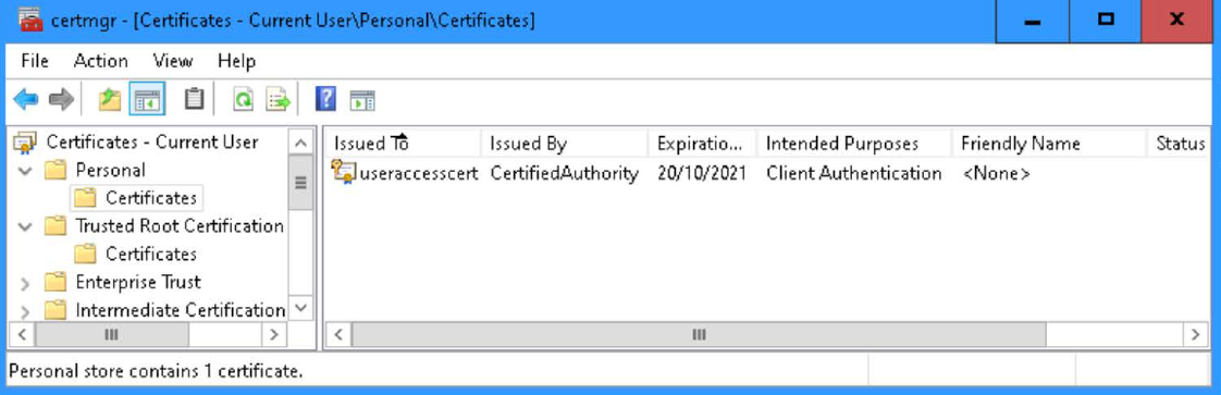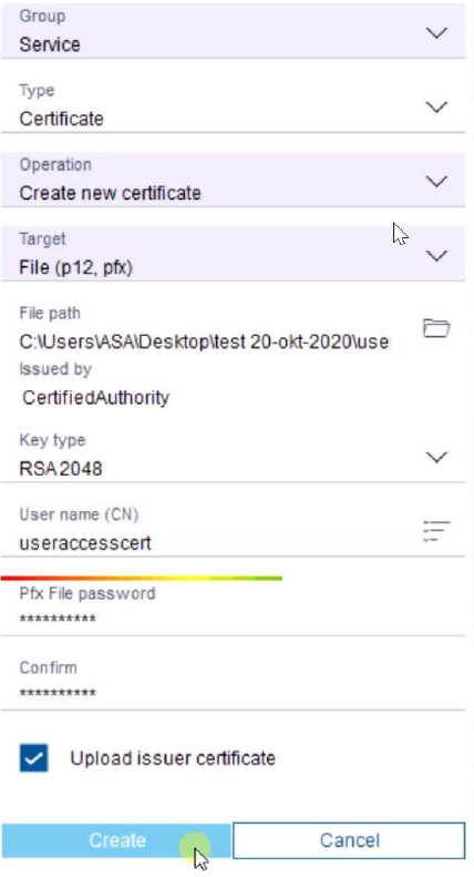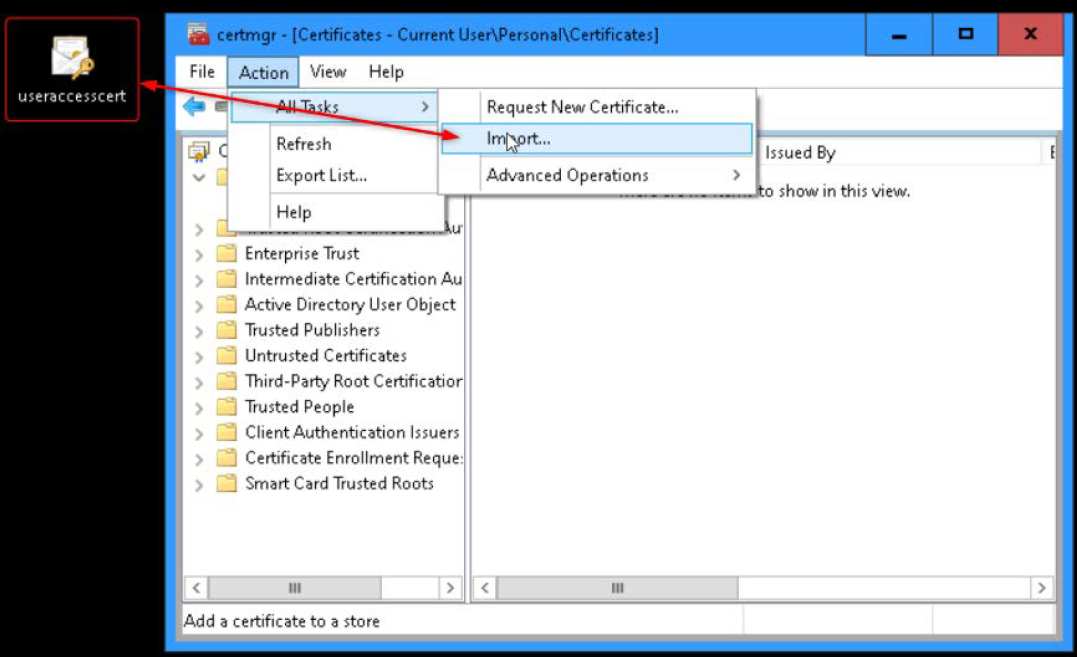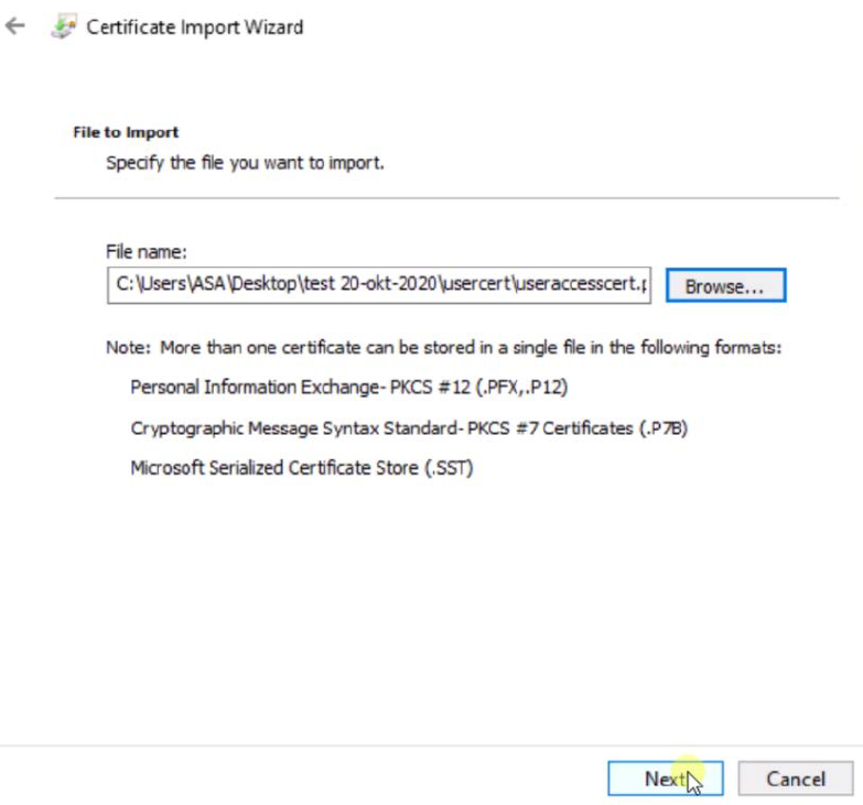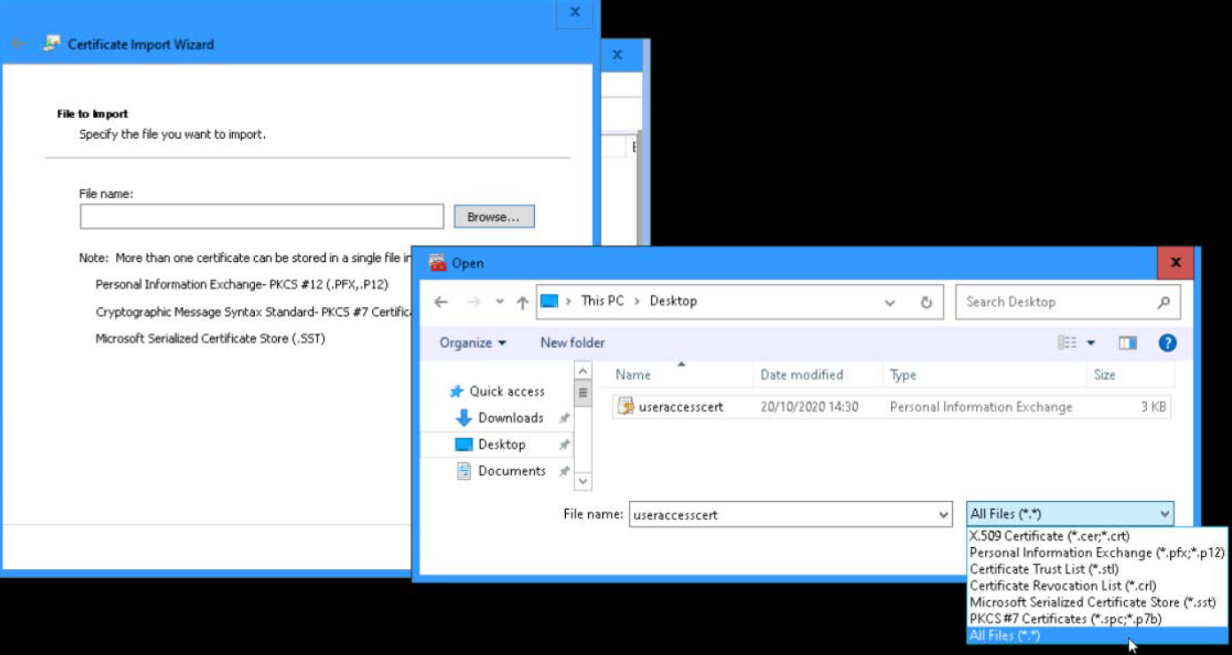 a. Put the useraccess.pfx certificate on an USB or copy to PC (desktop)