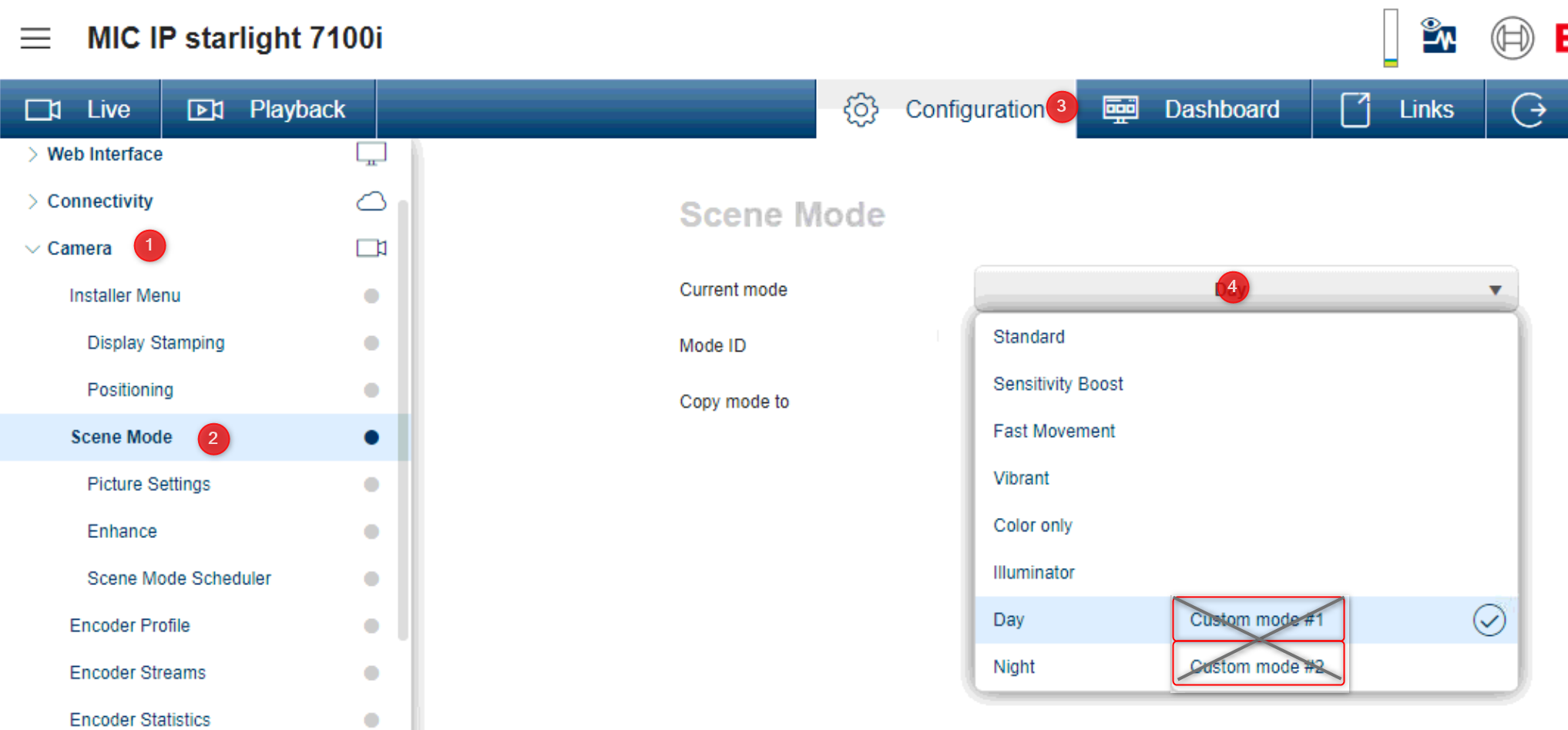 How to switch the scene modes Custom mode#1 & Custom mode#2 based on Day or Night for Bosch cameras?