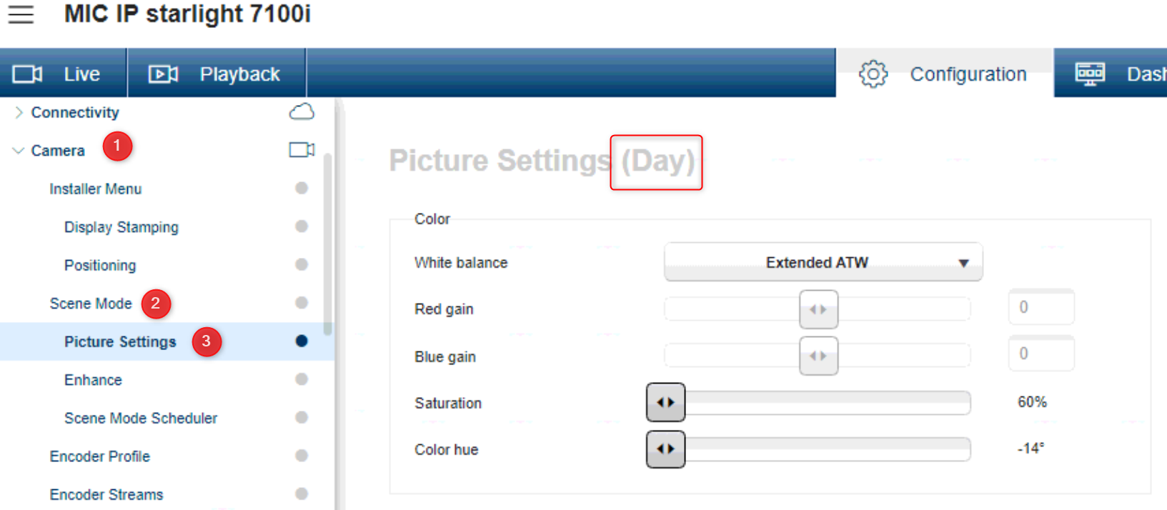 Select the scene mode "Day" and than go to "Picture settings" and configure, repeat this also for "Night"