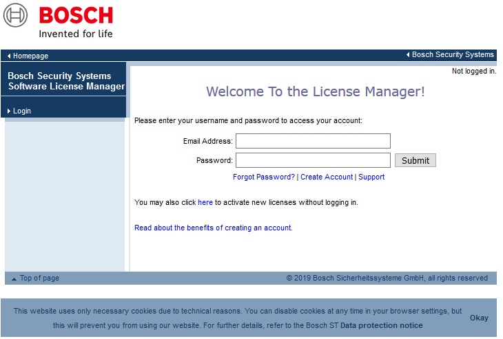 - Access Bosch Security Systems Software License Manager (SLMS) website and login using your credentials.