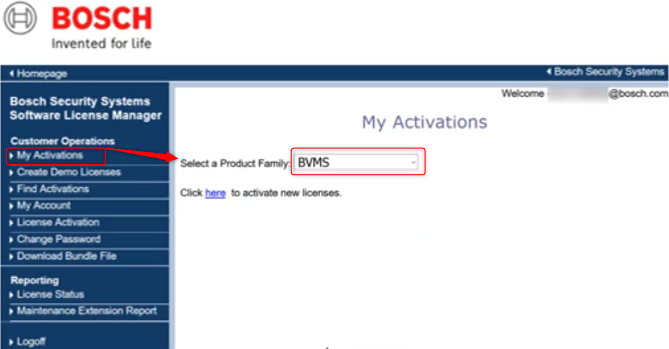 - Click My Activations and select BVMS from the Select a Product Family drop down list