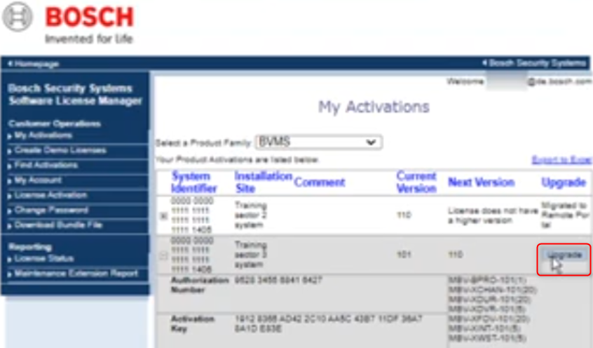 - If a system is entitled to upgrade to the next BVMS version, the Upgrade button will be available