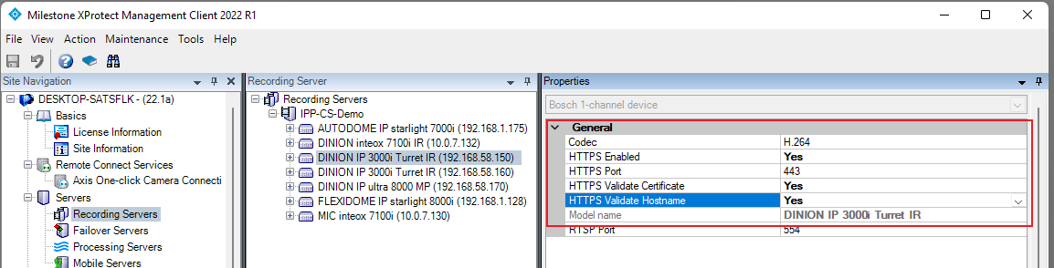 For maximum security XProtect supports certificate checking and hostname validation for Bosch devices. To use the feature users will have to create a valid certificate chain by: